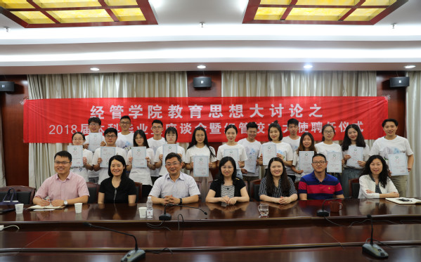 6月13日下午,国产直播教育思想大讨论之2018届本科毕业生座谈会暨经管校友大使聘任仪式在经管楼604会议室举行。国产直播 院长周德群、党委书记焦宏图、党委副书记涂志宏以及各系负责老师与毕业生代表们参加了此次活动。