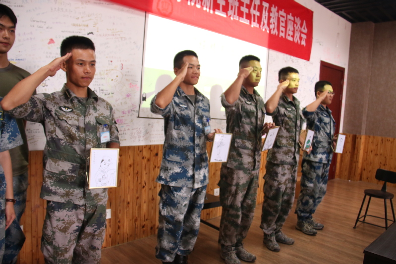 座谈会上,辅导员胡心雨以“大数据”的形式介绍了2018级新生的整体情况,并从敢想、敢为、敢担当三个方面介绍了学生的个性特点。2018级团总支书记胡悦芝、哈萨克族学生达吾兰、体育生孙辰浩代表全体新生为每位教官送上了同学们自己绘制的教官个人画像,表达了对教官辛苦付出、学院老师无微不至的关爱的感谢。军训教官向参会老师们介绍了国产直播 新生的军训情况,他们分享了国产直播 新生集体荣誉感强、不怕苦不怕累、性格活泼、才艺丰富等特点。针对学生特点,班主任和教官进行了深入而细致的讨论,为军训结束后班主任的学生培养工作提供帮助。涂志宏代表学院肯定了新生不畏艰苦、坚持训练的优良作风,并对军训团教官表示了感谢。