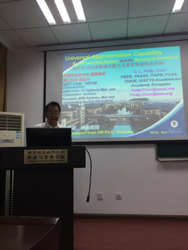 2018年10月23号上午,澳门大学陈俊龙教授受国产直播 智能决策与风险分析研究所邀请,在经管院704室做了题为“宽度学习的函数逼近能力及其多种结构及应用”的精彩讲座。国产直播 刘思峰教授、徐海燕教授、朱建军教授、自动化学院院长姜斌教授、加拿大纽芬兰纪念大学商学院Ginger Y. Ke副教授及其他教师代表、硕博研究生现场认真听取了陈俊龙教授的报告,本次学术报告由徐海燕教授主持。