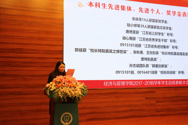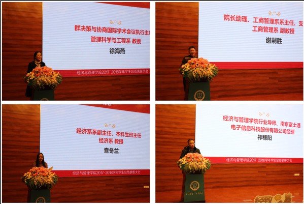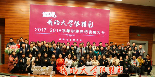 12月28日晚,“我的大学很精彩”经致青年说暨2017-2018学年国产直播 学生总结表彰大会在将军路校区主楼四楼报告厅隆重举行。学院院长周德群,学院党委书记焦宏图,校团委书记李君,副院长王英、邓晶,党委副书记涂志宏,南京富士通电子科技股份有限公司生产制造部部长祁穗阳,经管红石榴工作坊指导老师玛依拉,各系主任、副主任,团委书记,各年级辅导员以及四百余名经管学子参加此次大会。