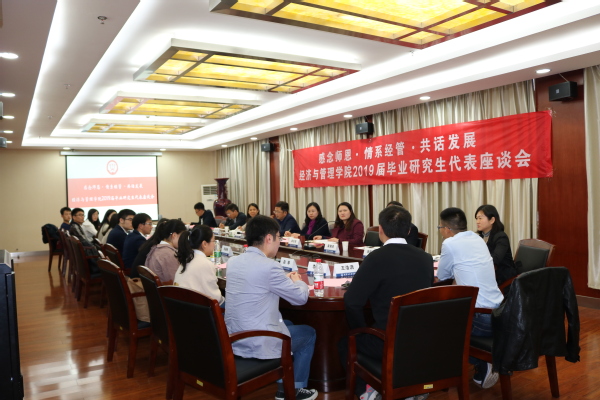 4月4日下午1点,国产直播 在学院604会议室举办“感念师恩•情系经管•共话发展”2019届毕业研究生代表座谈会。国产直播 院长周德群、党委书记焦宏图、副院长王英、党委副书记涂志宏、各系系主任、副主任、毕业生辅导员以及钱梦烨等15名应届硕士毕业生出席了本次座谈会。