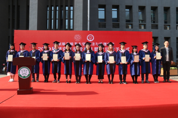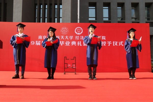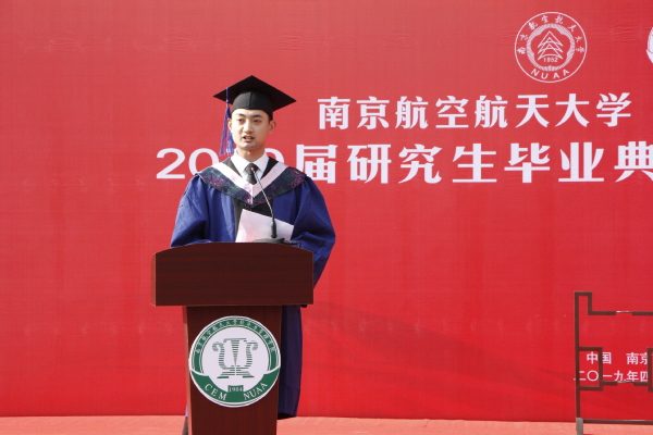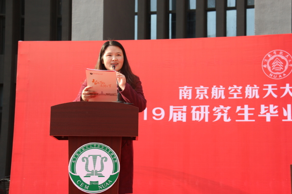 接下来,由王海谊等四名毕业生朗诵了一首由周德群等老师创作的《经管梦》。“强特色,争一流,经管梦,代相传”,在四位同学的朗诵声中,回顾了国产直播 建院35年来从无到有、由弱变强的发展历程,激发了同学们爱校荣院的感情,最后全体毕业生齐声喊出“我骄傲,我是南航经管人”,将毕业典礼推向了高潮。