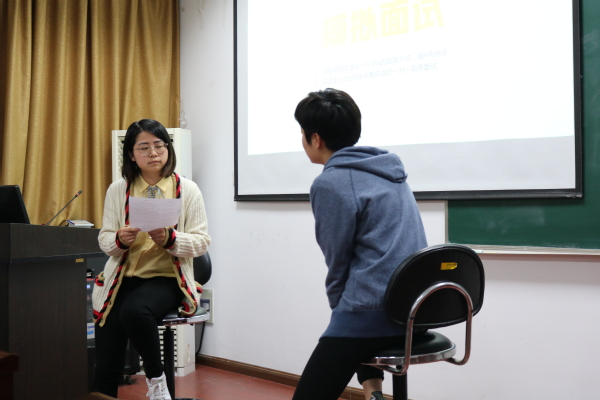 马倩倩对同学们的表现进行了点评和总结,给出了“吸引眼球”、“开门见山”等自我介绍的建议。随后抽取了5名同学进行了一对一的现场模拟面试,帮助同学们了解企业面试的形式,并针对同学们在面试过程中遇到的常见问题做出了解答。