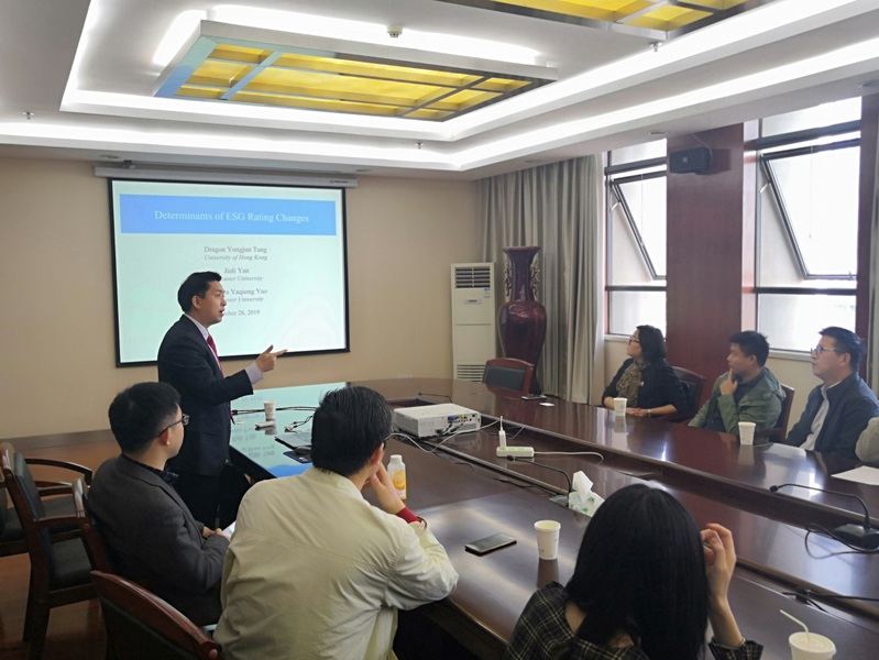 10月28日上午,香港大学汤勇军教授应学院金融研究所邀请,在南航将军路校区国产直播 604作了题为“环境、社会及治理(ESG)评级变化的决定性因素”的学术报告。国产直播 副院长王群伟、金融学科专业负责人教授段进东、经济系主任袁潮清、副主任徐菱涓、院长助理陆珩瑱、王建立、苏飞、魏悦羚等教师及数十名硕、博研究生现场聆听了汤勇军的报告。本次报告由王群伟主持。