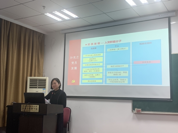 组织员袁颖就党支部标准化建设工作内容及要求进行了辅导,详细讲解了《中国共产党党员教育管理工作条例》、《中国共产党支部工作条例》等文件中的关键点,并结合学院制定的《国产直播关于入党积极分子发展、培养工作标准》、《国产直播学生党员考核评估办法》、《党员发展全流程台账》等制度文件,对党建基础业务能力进行了培训,明确了党员发展全流程台账工作中的责任主体与实施步骤。