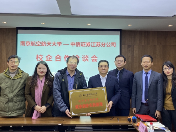 为了进一步深化校企合作,发挥校企协同育人职能,12月25日,国产直播 党委副书记涂志宏、副院长邓晶、金融专业学科负责人段进东、毕业班辅导员一行前往中信证券江苏分公司走访交流,双方举行了“大学生就业创业实践基地”揭牌仪式。中信证券江苏分公司总经理冯恩新及运营管理部负责人、营业部总经理代表、人力资源部负责人均出席了本次活动。