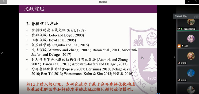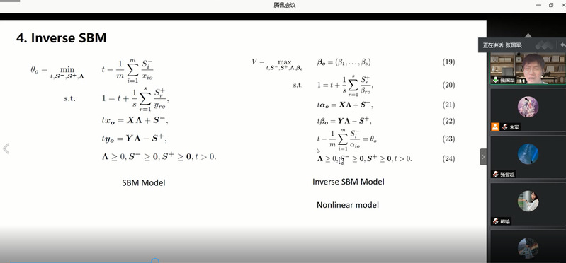 7月16日下午,青年学生张国军、王鑫、徐鹏受学院智能决策与风险分析研究所邀请,在腾讯会议分别作了题为A General Inverse DEA Model for Non-radial DEA、Target-oriented Robust Location-Transportation Problem、Pricing and entry strategies for competitive firms with managerially optimistic entrant的讲座。国产直播 教授徐海燕、谢乃明、朱建军等教师及部分硕、博研究生线上参加了张国军、王鑫、徐鹏的报告分享,本次学术报告由徐海燕主持。