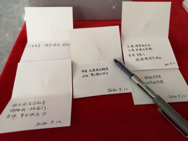 9月9日晚,国产直播 团委学生会的同学亲手为学院全体老师手写祝福贺卡,“一路桃李芬芳,永远花好月圆”“天涯海角有尽处,只有师恩无穷期”“老师,您辛苦了!”。行行真切小字,写下的是学生对老师无声的祝福;张张贺卡,折叠的是学生对老师道不尽的感激。