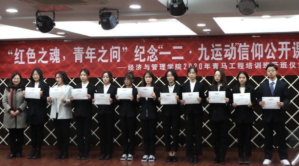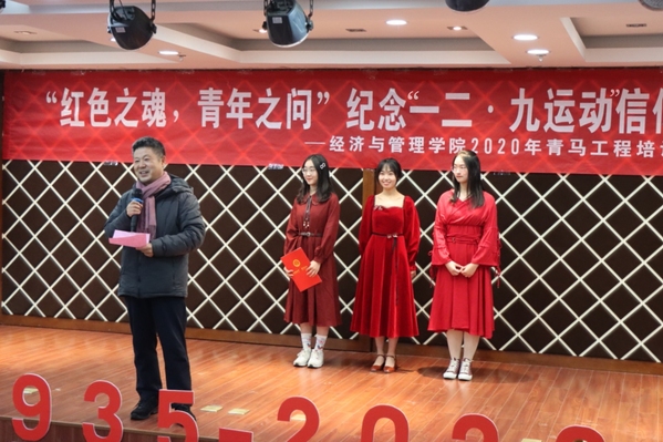 12月9日晚,国产直播 “红色之魂,青年之问”纪念“一二•九运动”信仰公开课暨2020年青马工程培训班开班仪式于经管楼A0305成功举办。国产直播 党委书记焦宏图,党委副书记涂志宏,经济系教授江可申,经管“红石榴”工作坊指导老师、学生处教师玛依拉•赛依力,团委书记刘小杨,以及各年级辅导员和二百余位学员出席了本次活动。