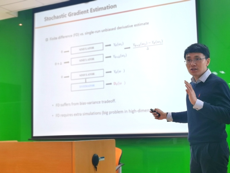 在此次学术交流活动中,彭一杰作了题为“基于梯度的随机仿真优化”的报告。报告首先介绍了随机仿真优化的背景知识,阐释经典的仿真优化问题研究随机系统样本表现期望的最大化,而基于梯度的算法是解决高维复杂随机仿真系统优化最有效的方法。随后回顾了随机梯度估计的经典方法,探讨使用一种广义似然比方法,系统性地解决获取有结构参数的不连续样本表现的无偏随机梯度估计问题,并介绍了其在金融、人工智能等问题中的应用。最后在广义似然比风险值敏感性估计的基础上,详细介绍了多尺度随机梯度下降算法,并通过算例说明所提出方法的有效性与在实际问题中的应用前景。