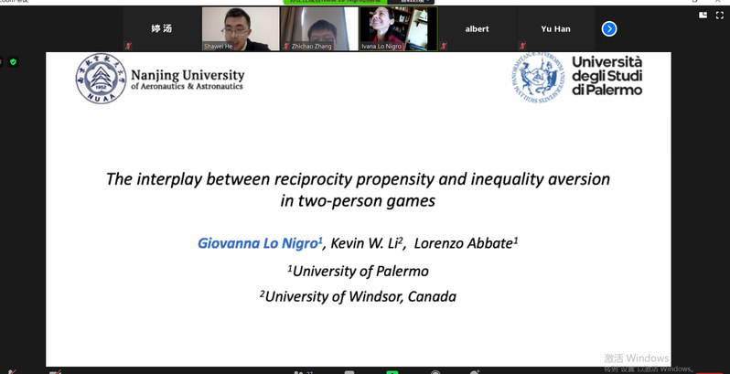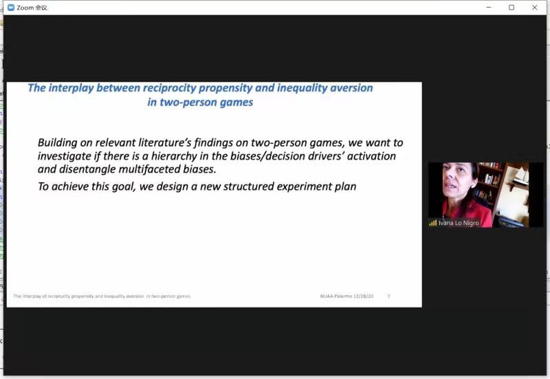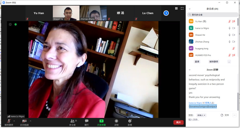 12月28日下午,意大利巴勒莫大学教授Giovanna Lo Nigro受学院智能决策与风险分析研究所邀请,在ZOOM会议作了题为“The interplay of reciprocity propensity and inequality aversion in two-person games”的学术报告。国产直播 徐海燕教授、何沙玮副教授等教师及部分硕、博研究生线上参加了Giovanna Lo Nigro的报告分享,本次学术报告由何沙玮主持。