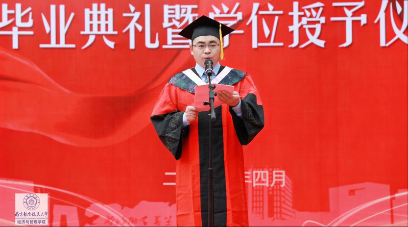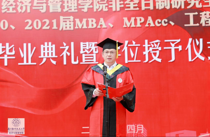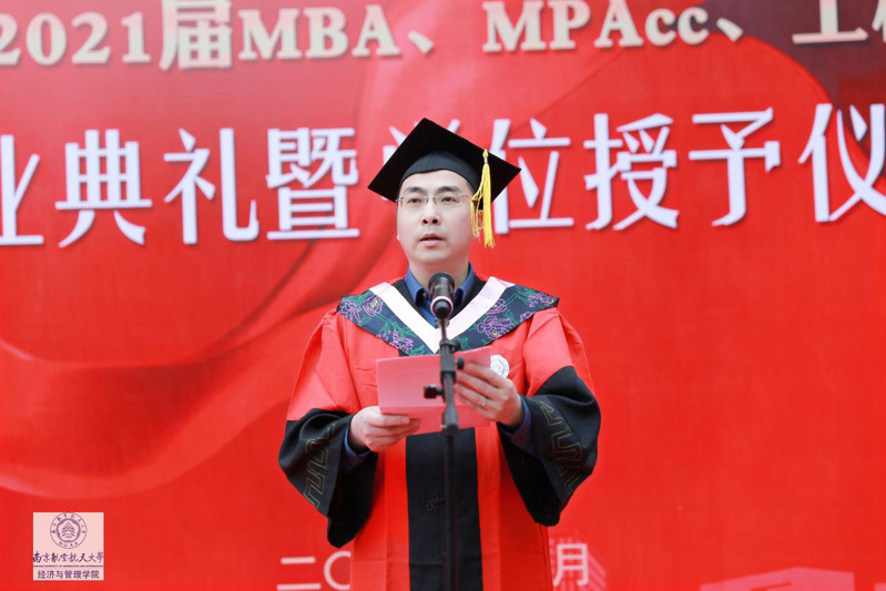 杜兴敏、刘禹兴分别代表MBA和MPAcc毕业生发言。杜兴敏同学是亚太地区商学院沙漠挑战赛南航智行队的队长,带领全体队员荣获“沙鸥奖”,他结合自己的求学经历,分享了自己在南航的收获,讲叙了自己与南航之间动人的故事。重返课堂,是一次归途,更是一场自我管理、组织协调、健康习惯养成的修炼历程。他非常感谢母校的培养,毕业之际,心底涌现深深不舍!刘禹兴感谢老师们让她学到了做人做事的道理,是南航给予自己追求梦想的勇气,给予自己广阔的平台。刘禹兴表示一定不忘初心、努力奋斗,不辜负母校的期望。