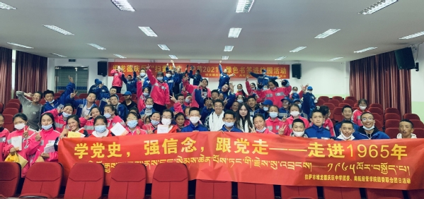 今年是中国共产党成立100周年,同时也是西藏和平解放70周年、西藏百万农奴解放62周年与西藏自治区成立56周年。值此背景, 2021年4月26日,国产直播 与拉萨市堆龙德庆区中学共同开展了一场联合团日活动,一起学习党史和西藏自治区成立的历史。国产直播 党委副书记涂志宏,团委书记刘小杨,堆龙中学团委书记、思政办主任次旦平措,国产直播-国产黄色直播 第22届研究生支教团成员张延波、约日古丽•托合提以及国产直播、堆龙中学百余名学生代表参加了本次活动。