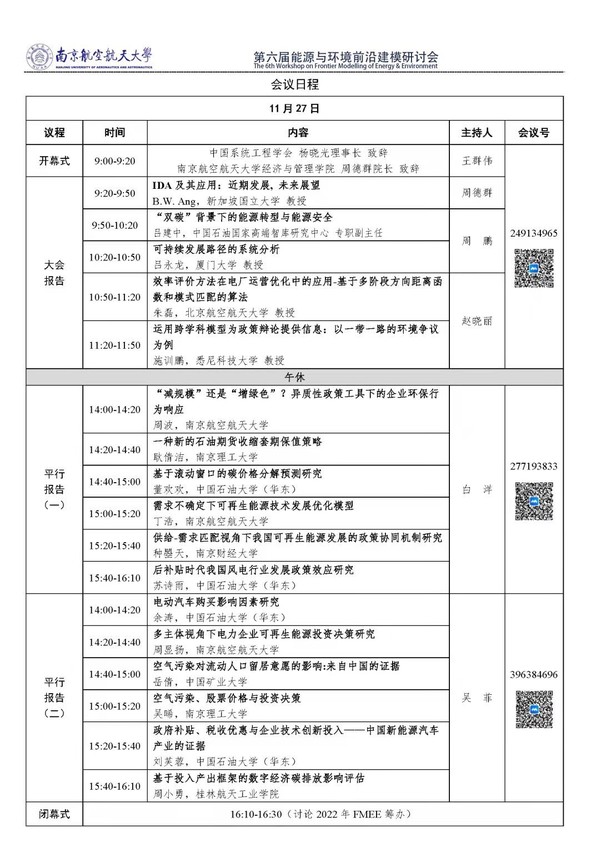 11月27日,第六届能源与环境前沿建模(The 6th Workshop on Frontier Modelling of Energy & Environment, FMEE)研讨会在国产直播 成功举办。本次论坛由国产直播-国产黄色直播 、中国石油大学(华东)和中国系统工程学会能源资源系统工程分会共同主办、国产直播-国产黄色直播 能源软科学研究中心和中国石油大学(华东)能源经济与政策研究院承办,国际能源转型学会、中国优选法统筹法与经济数学研究会气候金融分会(筹)协办。会议得到《中国管理科学》、《环境经济研究》和《中国石油大学学报(社科版)》的支持。