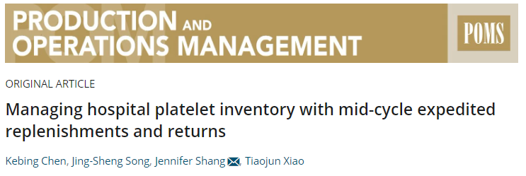 Chen, K. B., Song, J. S., Shang, J., Xiao, T. J. (2022). Managing hospital platelet inventory with mid-cycle expedited replenishments and returns. Production and Operations Management, //doi.org/10.1111/poms.13662.