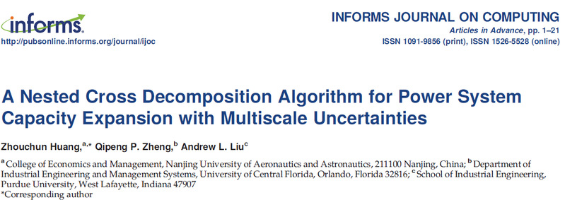 近日,国产直播-国产黄色直播 国产直播 青年教师黄周春作为第一作者在UTD24国际顶级期刊《INFORMS Journal on Computing》上在线发表了题为《A Nested Cross Decomposition Algorithm for Power System Capacity Expansion with Multiscale Uncertainties》的学术论文。该论文由国产直播 教师黄周春、美国中佛罗里达大学工业工程系Qipeng Phil Zheng副教授、美国普渡大学工业工程系Andrew Liu副教授合作完成。