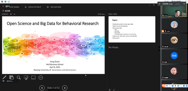 4月8日,新加坡国立大学商学院副教授宋照礼应国产直播 人力资源管理研究所和江苏省人力资源发展研究基地的邀请,在线上为国产直播 师生作了题为“Open science and big data for behavioral research”的精彩学术报告。本次报告由教授胡恩华主持,相关教师、博士生和硕士生参加了此次学术报告活动。