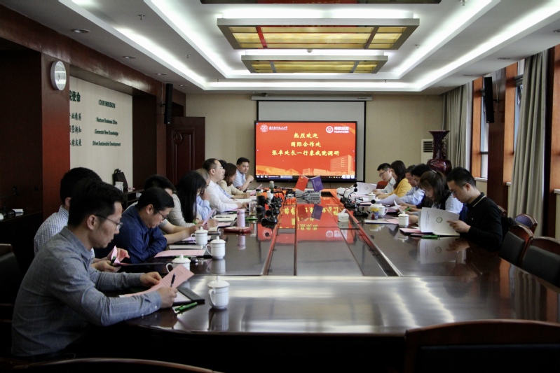 5月18日国际合作处处长张卓、副处长张国权、沈敏、综合事务科科长祖语嫣、国际合作项目科科长田立丰、出入境服务中心主任董峰来国产直播 调研座谈。国产直播党委书记苏州、院长周德群、院党委副书记胡苹、副院长王子龙、谢乃明、查冬兰、院长助理蒋昕嘉、欧阳林寒、管工系系副主任达高峰、工商系赵亚普副教授、院国际合作事务秘书许志卓参加了此次调研。