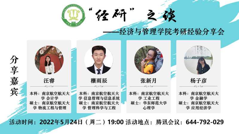 为引导学生理性考研,加强考研指导,5月24日晚,国产直播 开展经“研”之谈——2019级考研经验分享会,2019级本科辅导员胡心雨,往届优秀考研学生代表汪睿、穰雨辰、张新月、杨子彦以及备战考研的同学们参加此次活动。