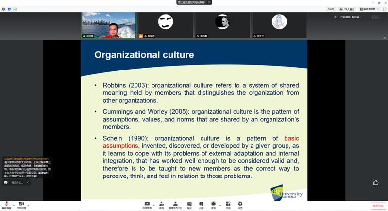6月21日下午,澳大利亚中央昆士兰大学工程与技术学部副教授赵宪博,应国产直播-国产黄色直播 国产直播 的邀请,通过腾讯会议在线方式(腾讯会议号:920-890-532)为国产直播 师生作了题为“Organizational change and relevant theories: a historical perspective”的学术报告,本次报告由国产直播 副院长查冬兰教授主持,时茜茜、高广鑫、杨一帆、陈毓迪、张燕、周志鹏等教师,以及硕士/博士研究生参加了此次学术活动。