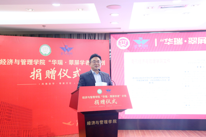 康宜华院友对学校和学院的邀请表示感谢,对能为母院发展助力感到欣慰和自豪。他以亲身经历激励青年学者们要树立远大理想,勤勉敬业,在实干中实现自己的人生价值。他强调,科技是第一生产力、人才是第一资源、创新是第一动力,要有“让世界一流人才为我所用”的眼光,实现人才“量的合理增长,质的稳步提升”。他表示,捐赠是有限的,华瑞集团立足长远,正在和学院共同探索教育培训合作新机制,瞄准引进世界一流人才,增强学院持续造血功能,形成更大的高层次人才蓄水池。