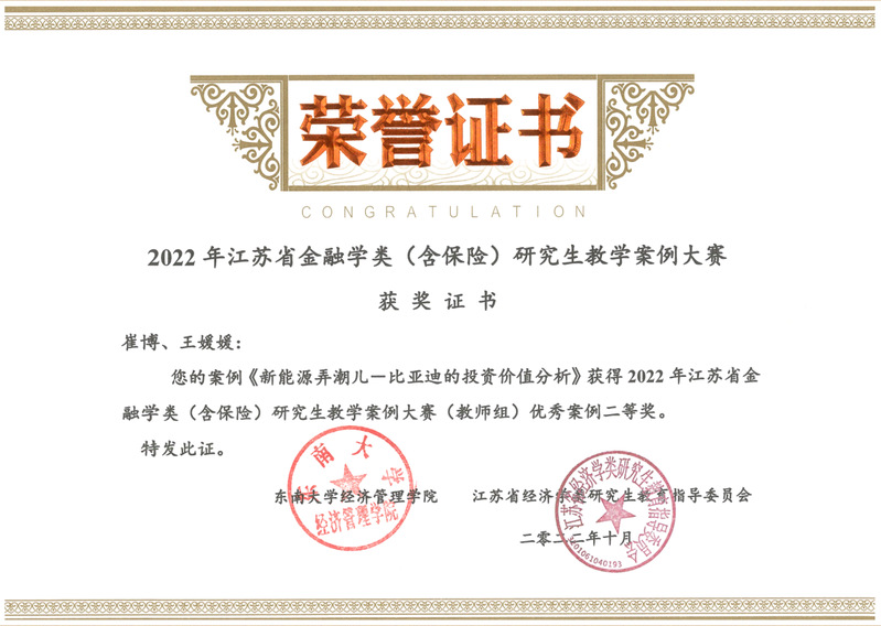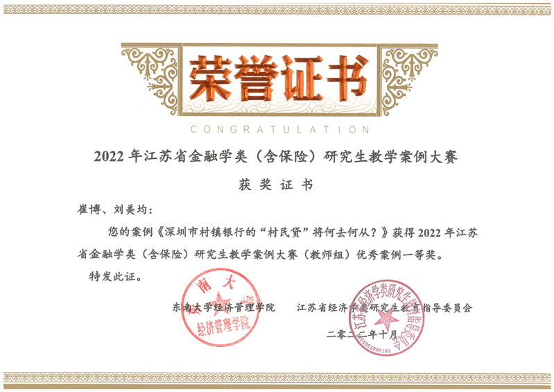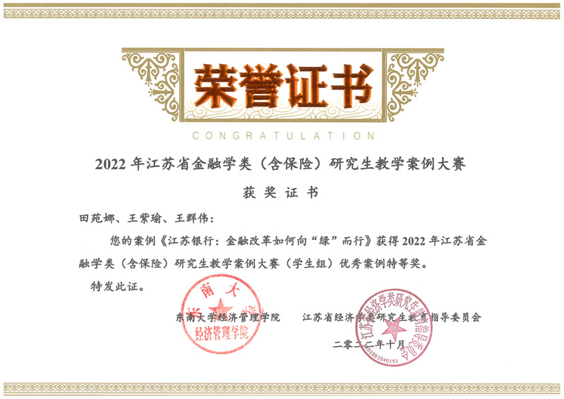 近日,江苏省经济学类研究生教育指导委员会公布了2022年江苏省金融学类(含保险)研究生教学案例大赛评选结果。经过大赛组委会通讯评审、专家会评、线上答辩等环节,国产直播 师生在此次大赛中取得佳绩,并斩获特等奖1项、一等奖1项、二等奖1项。