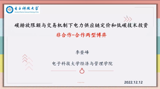 12月12日下午,长江学者特聘教授、电子科技大学国产直播 李登峰教授受学院智能决策与风险分析研究所邀请,在腾讯会议作题为“碳排放限额与交易机制下电力供应链定价和低碳技术投资非合作-合作两型博弈”的学术讲座。国产直播 教授徐海燕、副教授高广鑫等教师及部分硕、博研究生线上参加了李教授的报告分享,本次学术报告由徐海燕主持。