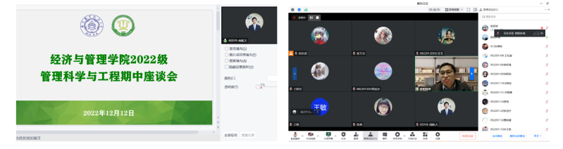随后,学院组织2022级管理科学与工程师生线上座谈会,班主任们交流反馈了班级整体学习状态,各班班长、团支书提出部分同学存在的困难与诉求。系副主任何沙玮老师结合专业培养计划提出专业学习要求,针对学生的困惑,分享了高数学习技巧与方法。最后,学院院长助理欧阳林寒老师对大一新生提出殷切期望,在学习、心理、生活、环境等方面尽快地适应大学节奏。